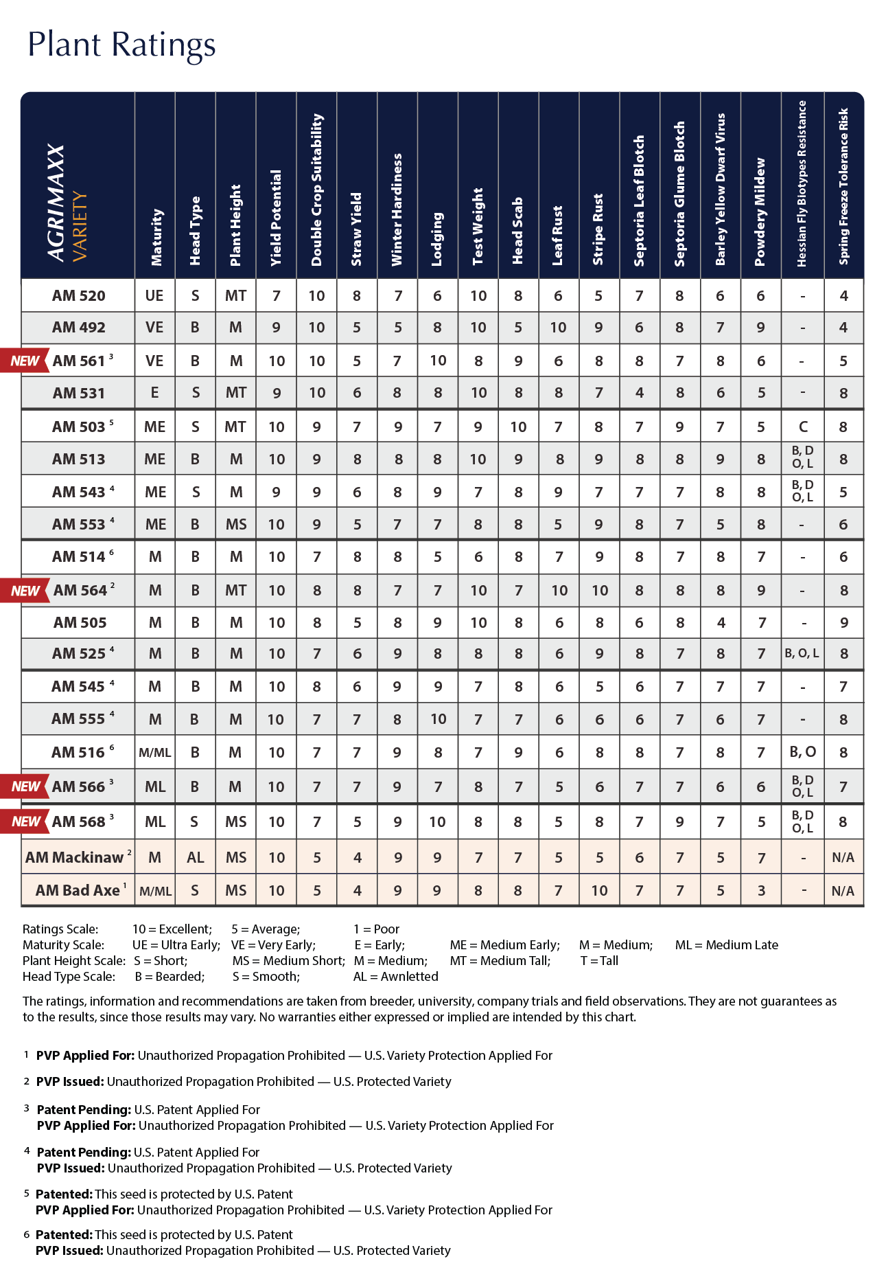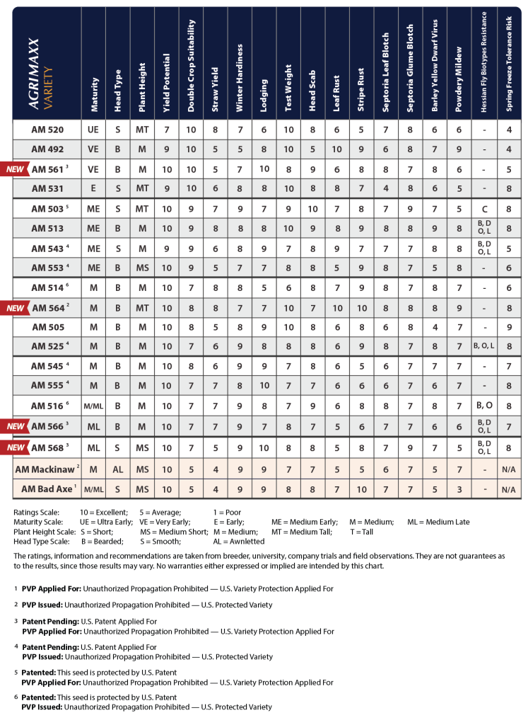 AgriMAXX Wheat introduces five new high-yield wheat varieties: AM 561, AM 564, AM 566, AM 568 and AM Bad Axe. They offer better standability, disease resistance, and strong performance across soil types.